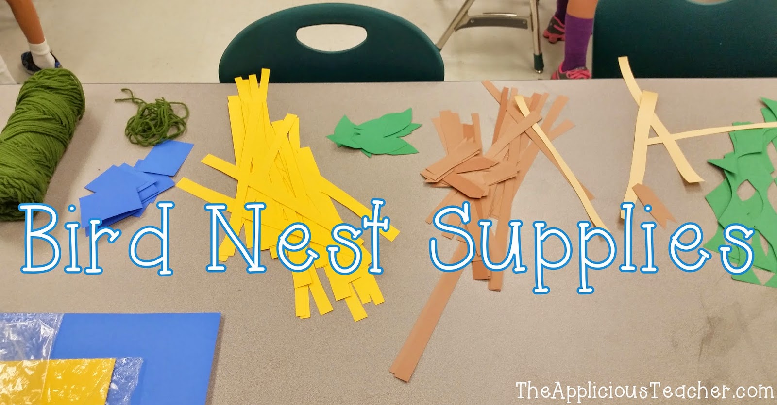 I filled up my back table with bird supplies. Brown paper for sticks, yellow paper for hay, green paper for grass, cut out leaves for leaves, and blue for the bits of blue that one bird loves to decorate his little home with.