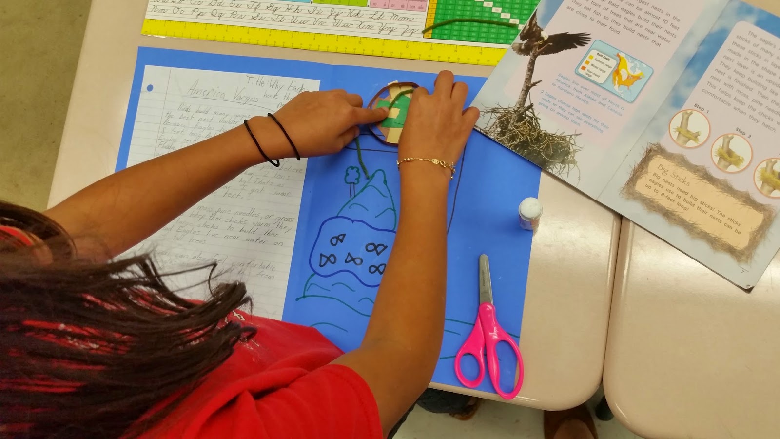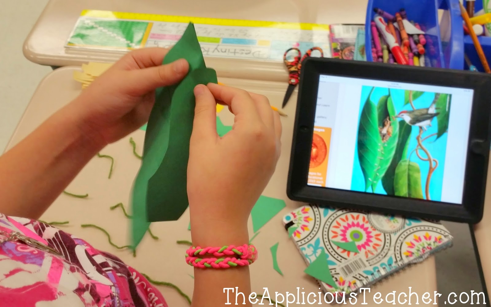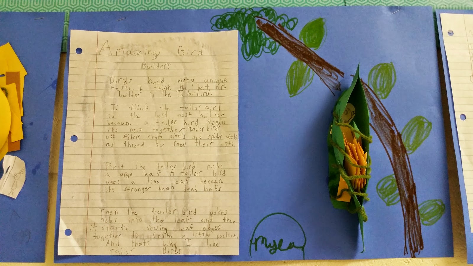 Love how this students is using the green yarn to sew her leaves together just like the bird in her paper.