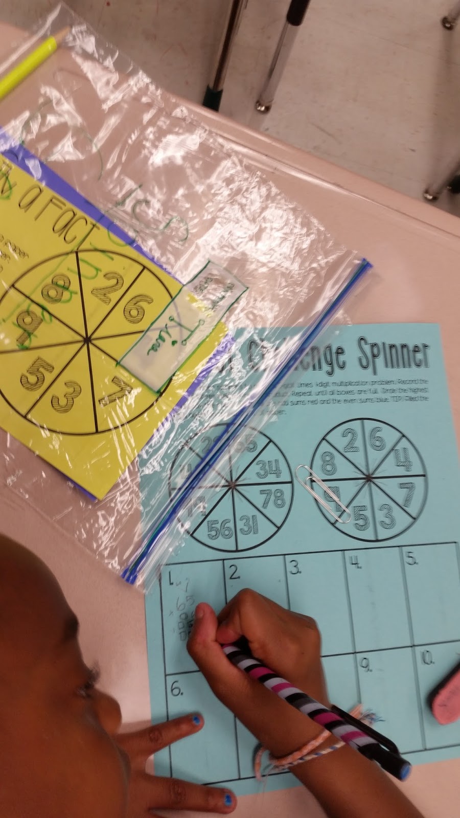 My thirds were most excited about making their own summer review supplies! ย Spinner games are an old favorite and they are so easy to do at home. To make our little โSpinner Game Packโ, ย students filled a gallon size baggie with a pencil and a paperclip.
